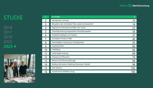 Wer tiefer in die Ergebnisse einsteigen möchte, kann den ausführlichen Studien-Flyer direkt bei der Heinze Marktforschung anfordern marktforschung@heinze.de. Er gibt einen kompakten Überblick über die inhaltliche Tiefe der Untersuchung – von der Analyse der Zielgruppe über Auftragslage und Baustellenrealität bis hin zu detaillierten Auswertungen zu Informationskanälen, Architekten-Portalen, Social Media, Künstlicher Intelligenz und Nachhaltigkeit.